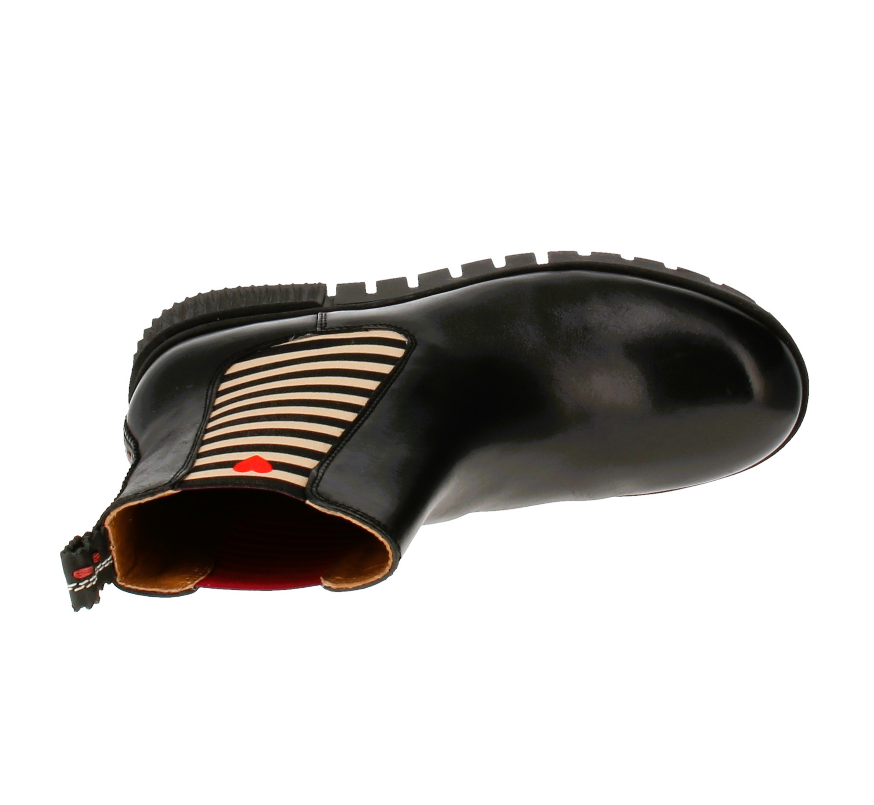 Die Stiefelette Naelle von Crickit aus hochwertigem Kalbsleder verbindet zeitlosen Chelsea-Charme mit modernen Details. Der elastische Einsatz mit Streifen und Herzen setzt einen besonderen Akzent, während die markante Profilsohle dem Design eine lässige Note gibt. Innen sorgt vegetabil gegerbtes Leder für angenehmes Fußklima, ergänzt durch ein herausnehmbares, weich gepolstertes Fußbett. Mit der charakteristischen Crickit-Naht an der Ferse zeit der Boot Liebe zum Detail.
