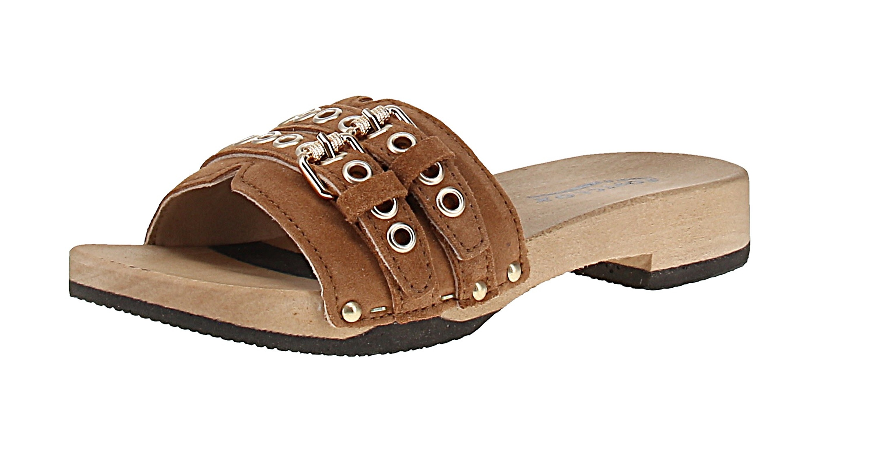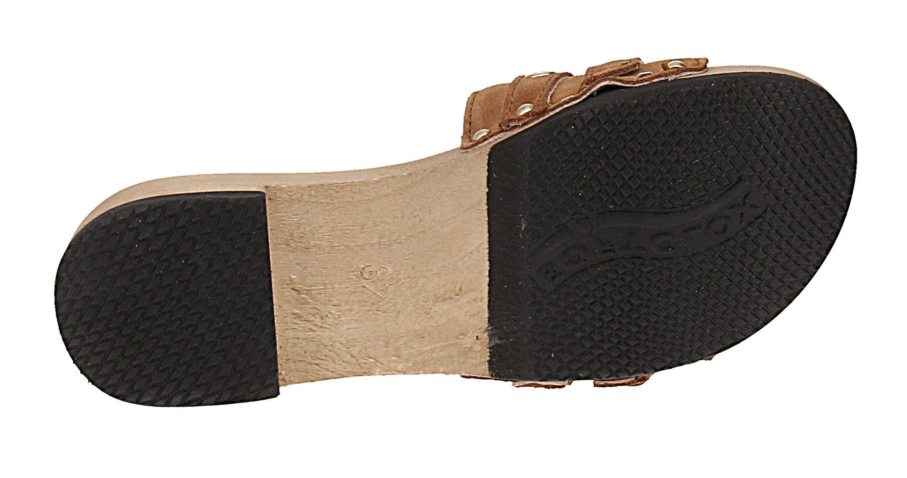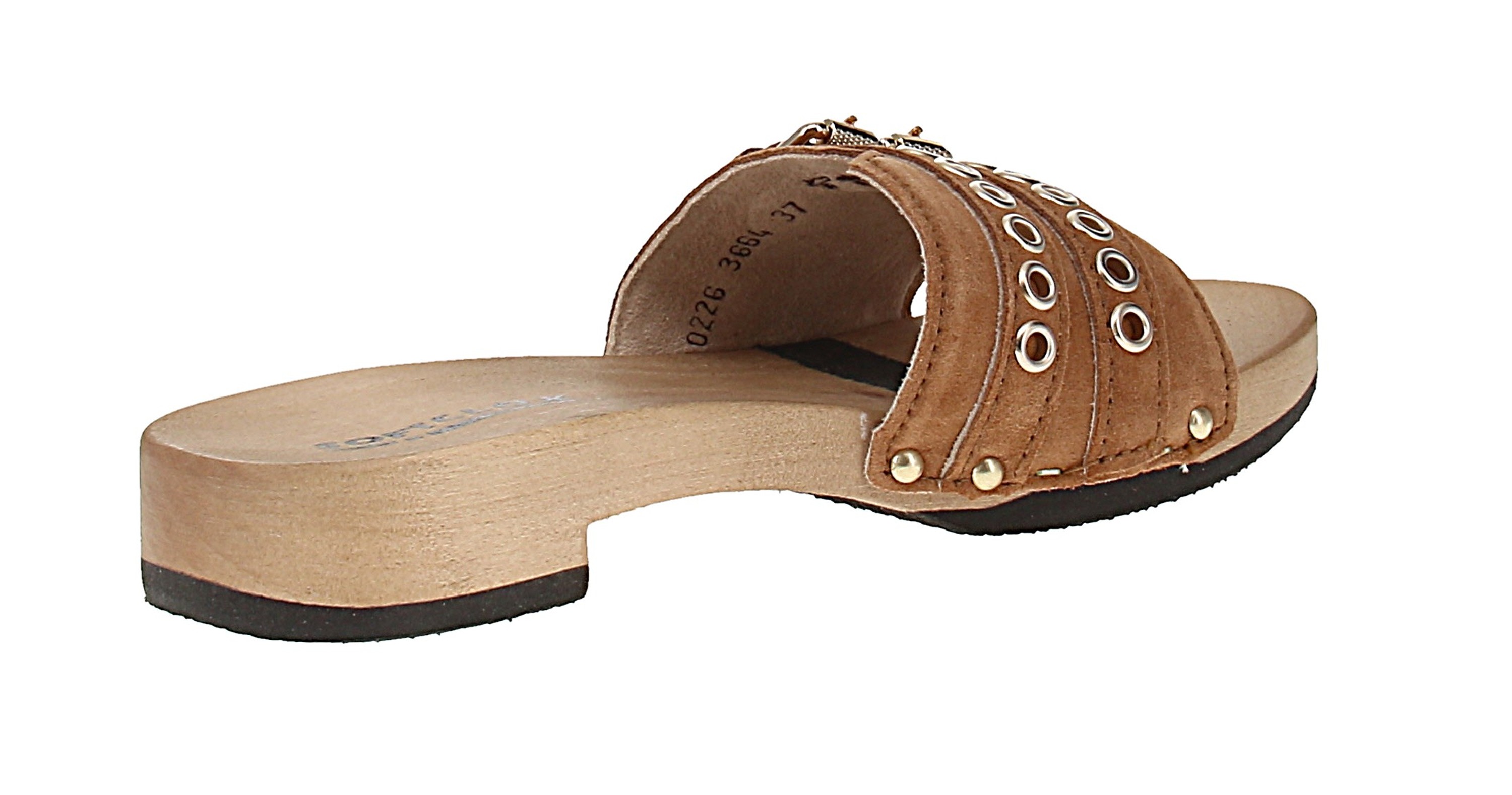 - Sohle: Holz mit Gummibesatz; Absatzform: Blockabsatz
