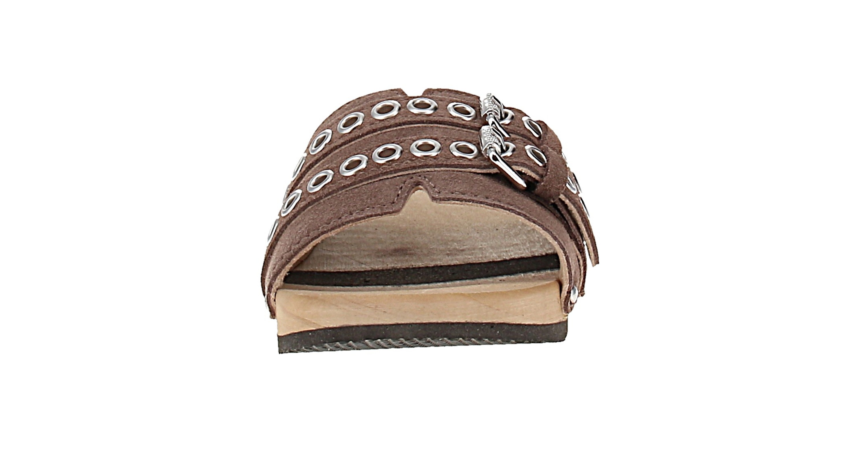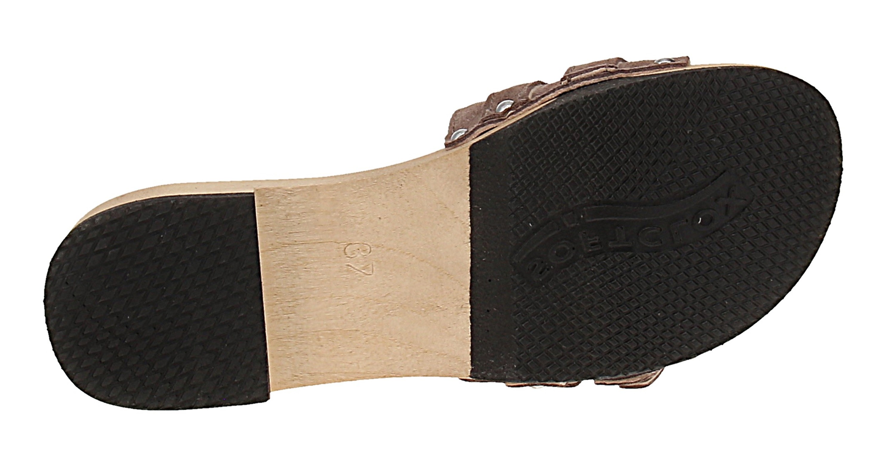 - Sohle: Holz mit Gummibesatz; Absatzform: Blockabsatz