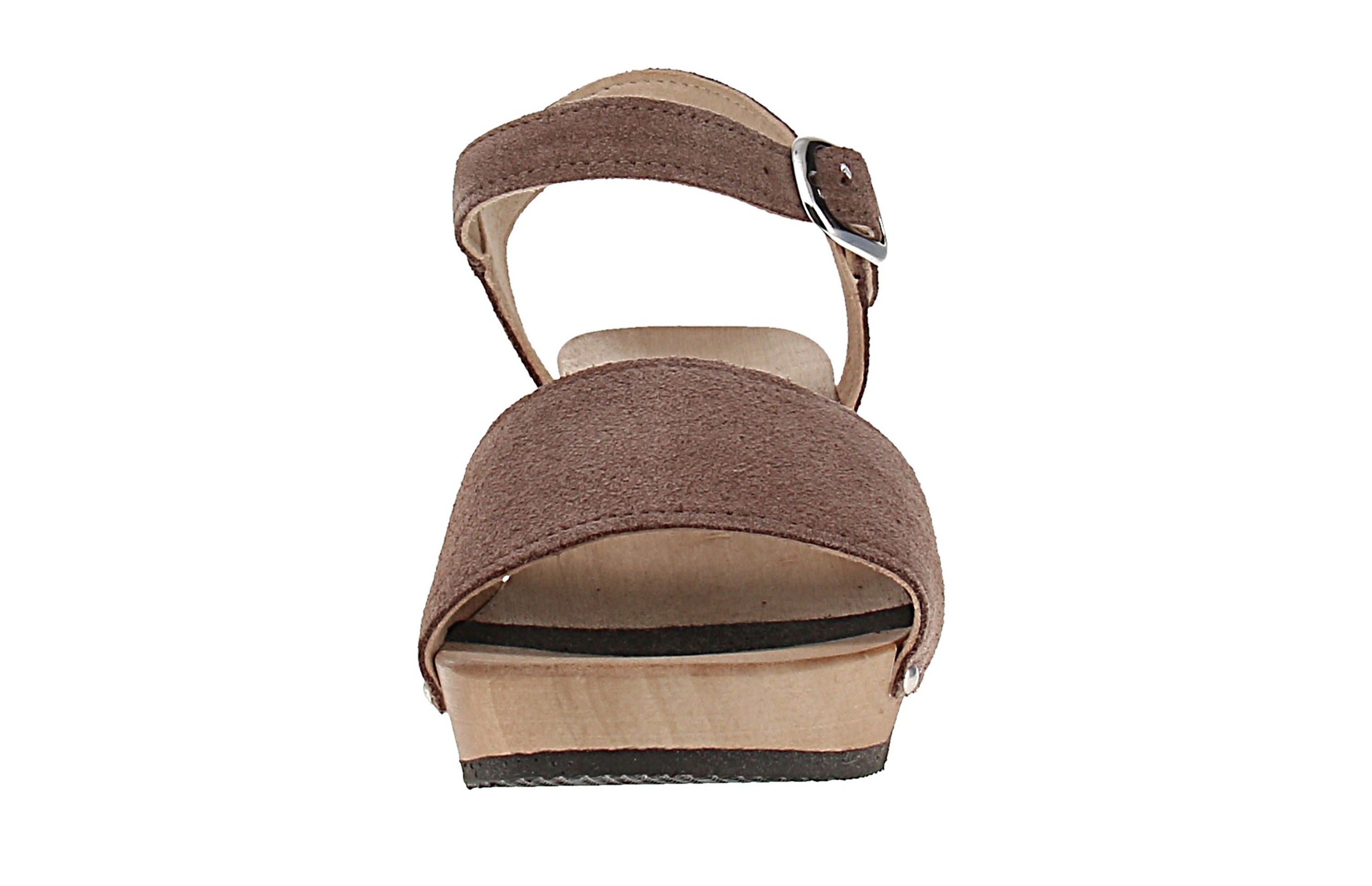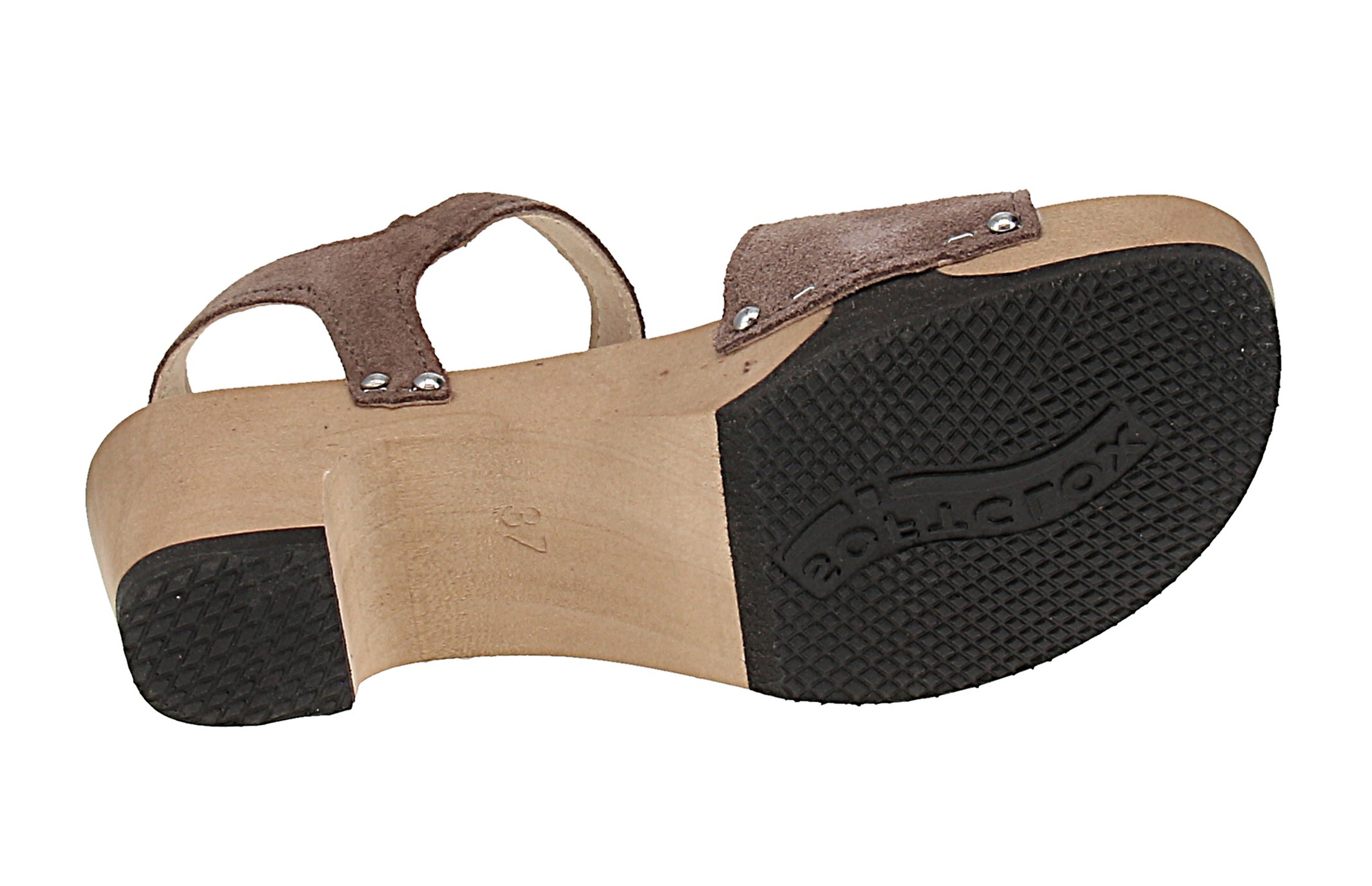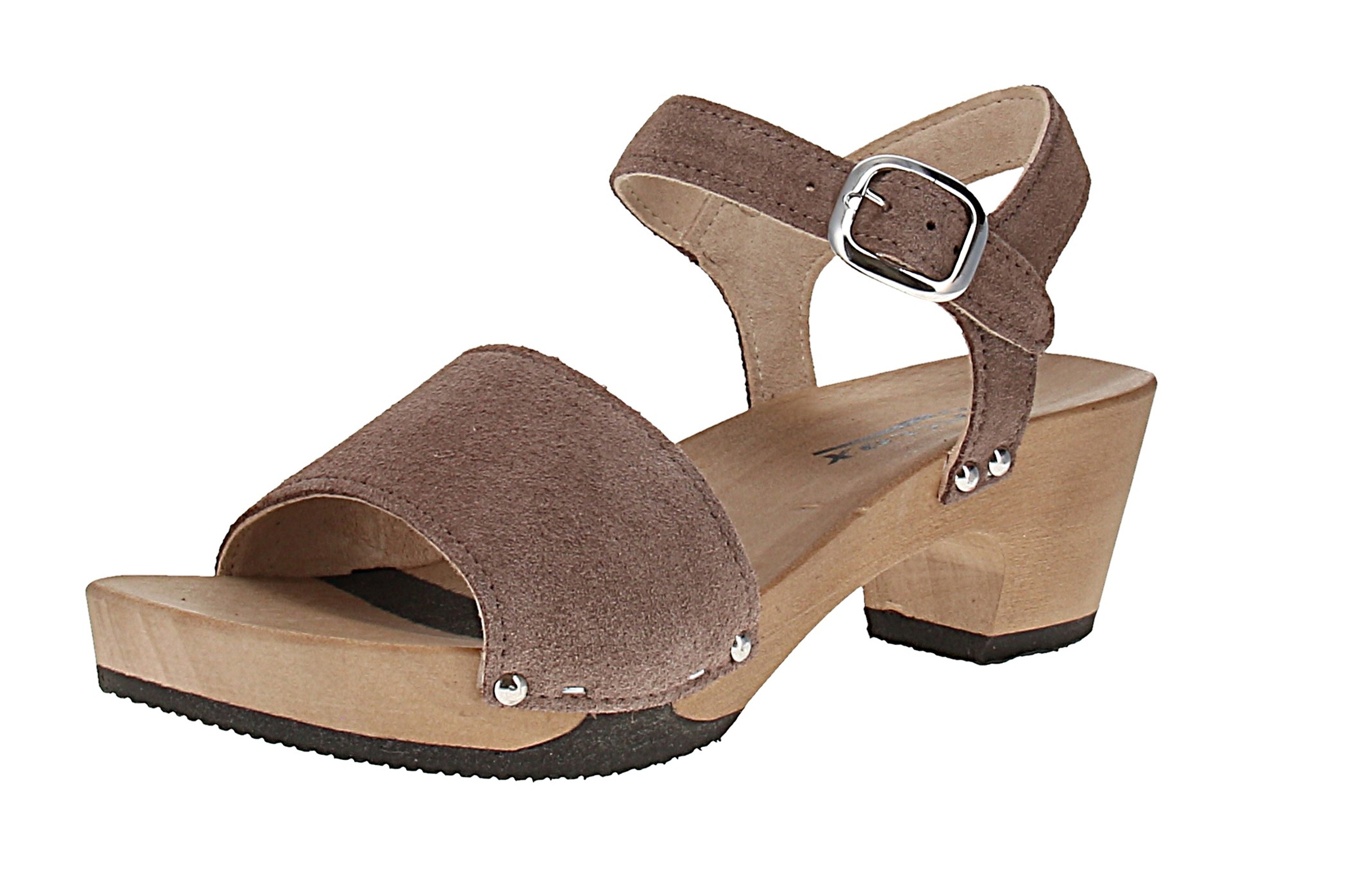 - Sohle: Holz mit Gummibesatz; Absatzform: Blockabsatz
