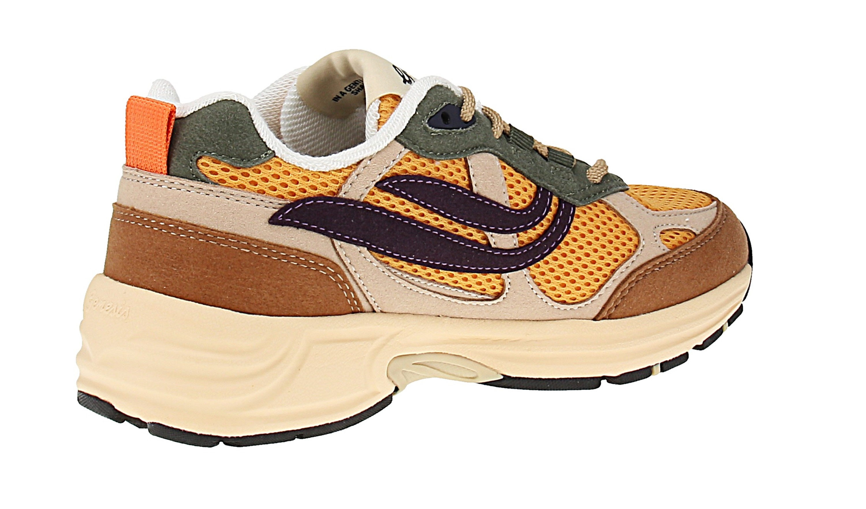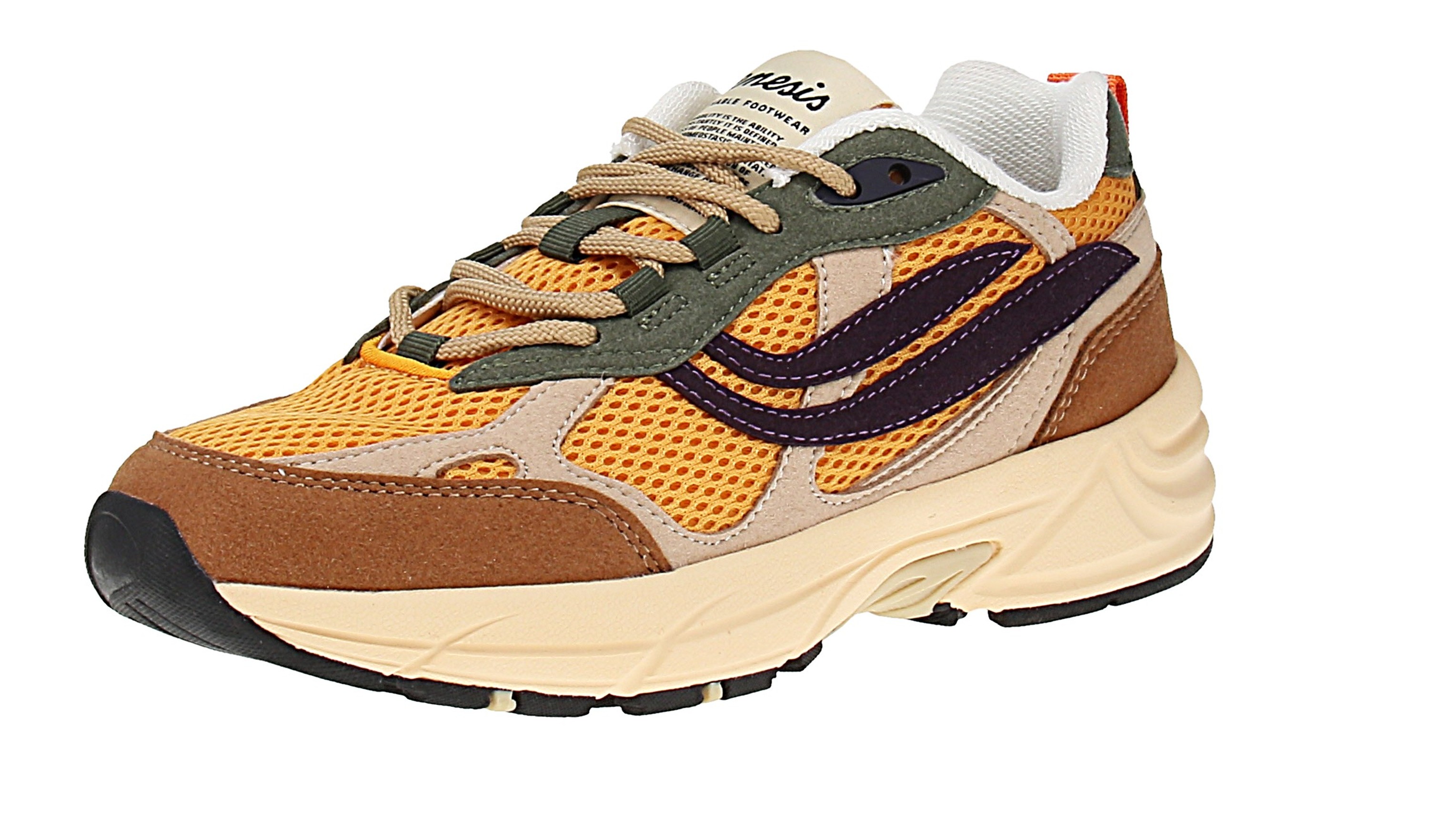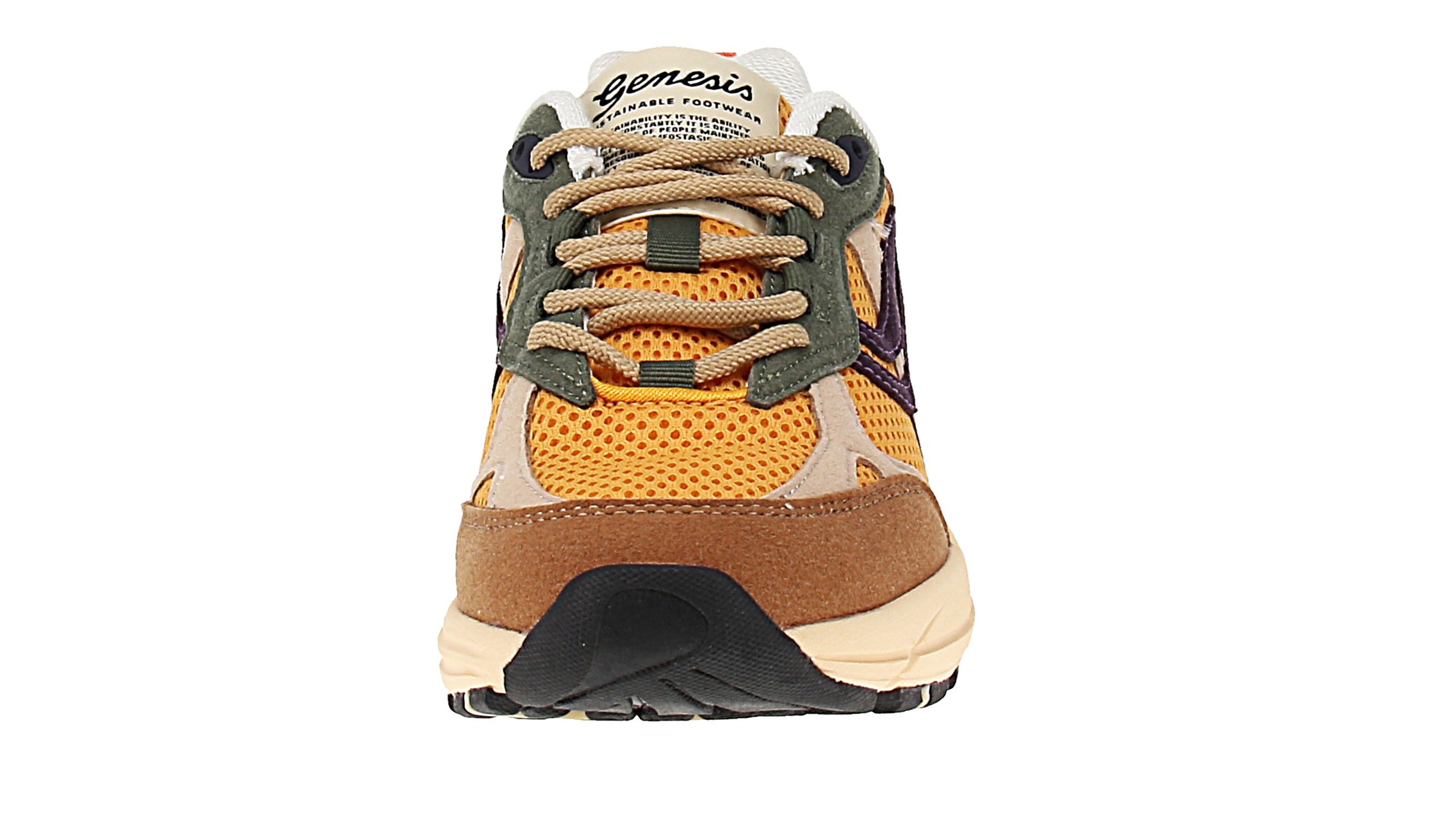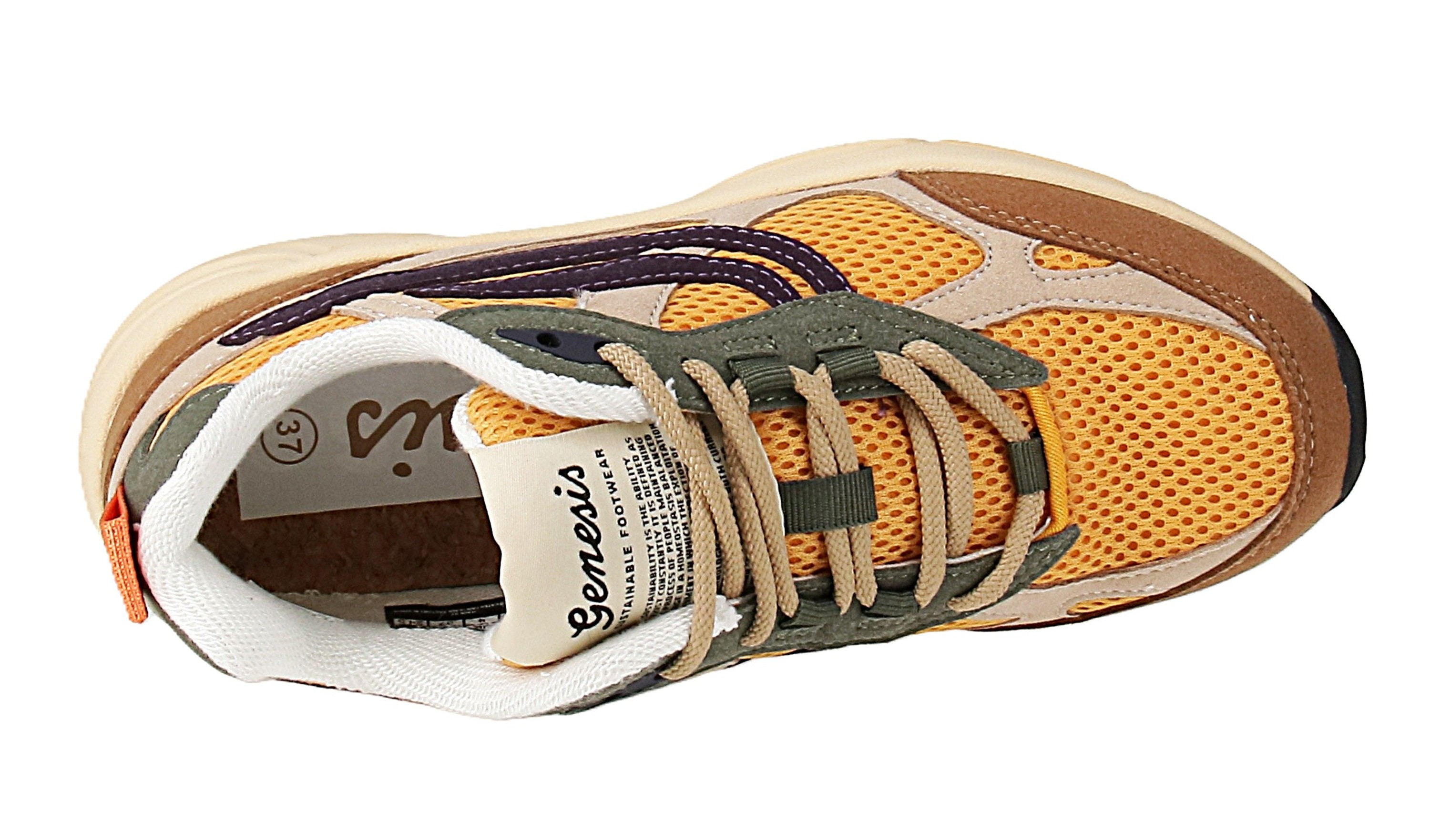 Diese veganen Sneaker von Genesis bestehen größtenteils aus recyceltem Material und sind fairtrade. So zum Beispiel besteht das Obermaterial aus Maisabfällen und recyceltem PET, die Einlegesohle aus recyceltem PU-Schau und FSC-zertifiziertem Kork, das Innenfutter aus Bambusfasern und recyceltem PET, die Laufsohle aus mindestens 40 % Naturkautschuk (aus nachhaltigem Anbau) und 10 % aus recyceltem PET-Flaschen und die Schnürsenkel und Nähte zu 100 % aus recycelten PET-Flaschen bestehen. Nicht nur ist dieser Sneaker aus nachhaltigen und recyceltem Materialien gefertigt, auch ist er aufgrund seines Designs und seiner Farbkombination ein wahrer Hingucker im Retro-Look.