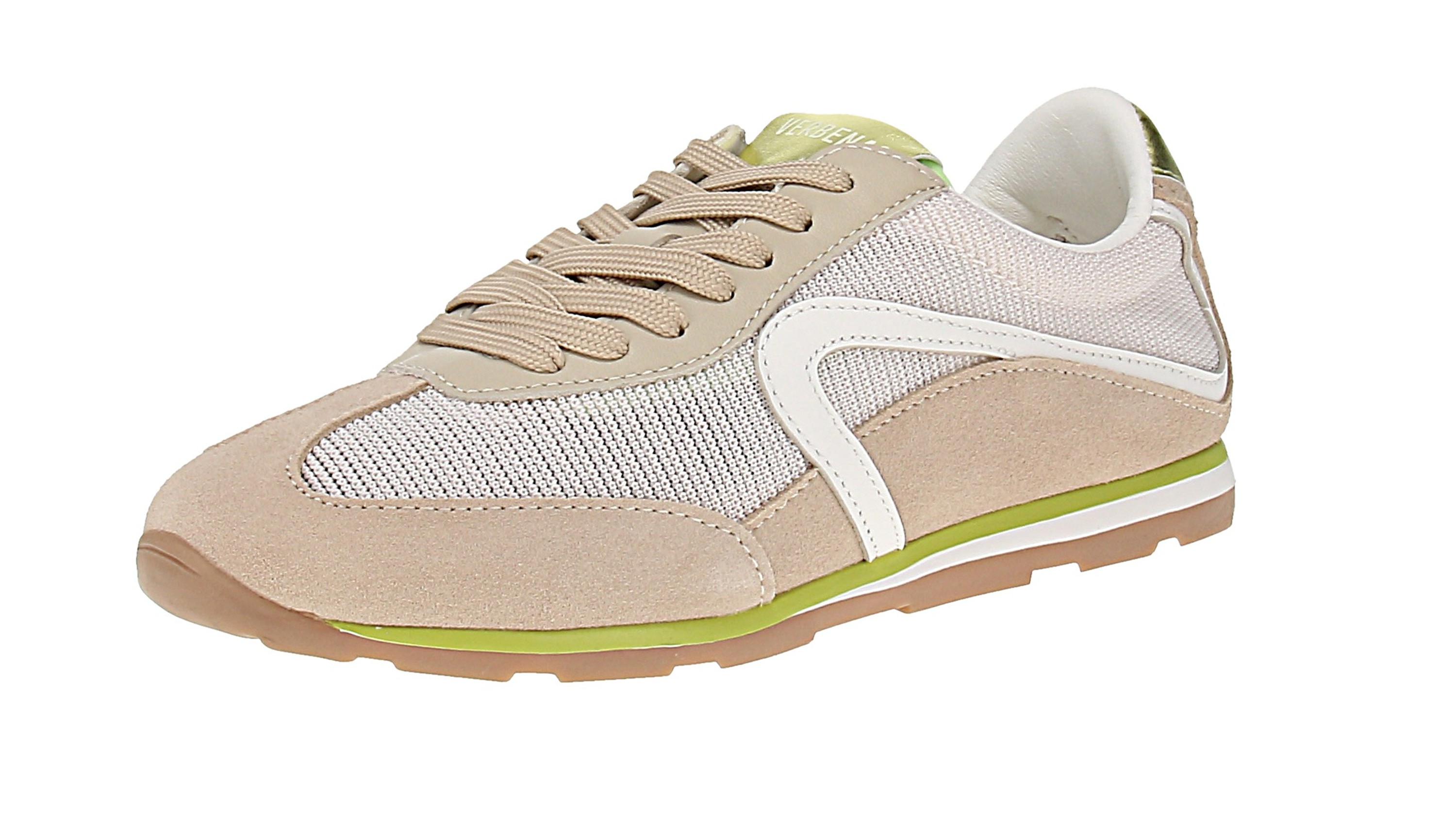 Inspiriert von den 70er- und 80er-Jahren überzeugt dieser Sneaker von Verbenas mit schlanker Silhouette, niedrigem Profil und sportlichem Retro-Charakter. Das atmungsaktike Textilgewebe in Kombination mit Leder sorgt für einen modernen Look und angenehmen Tragekomfort. Zu weiteren Besondernheiten zählen außerdem die markante Zehenkappe und die dynamischen Seitenlinien sowie die dreifarbige Sohle. Das gepolsterte Futter und die flexible Laufsohle sorgen für hohen Tragekomfort.